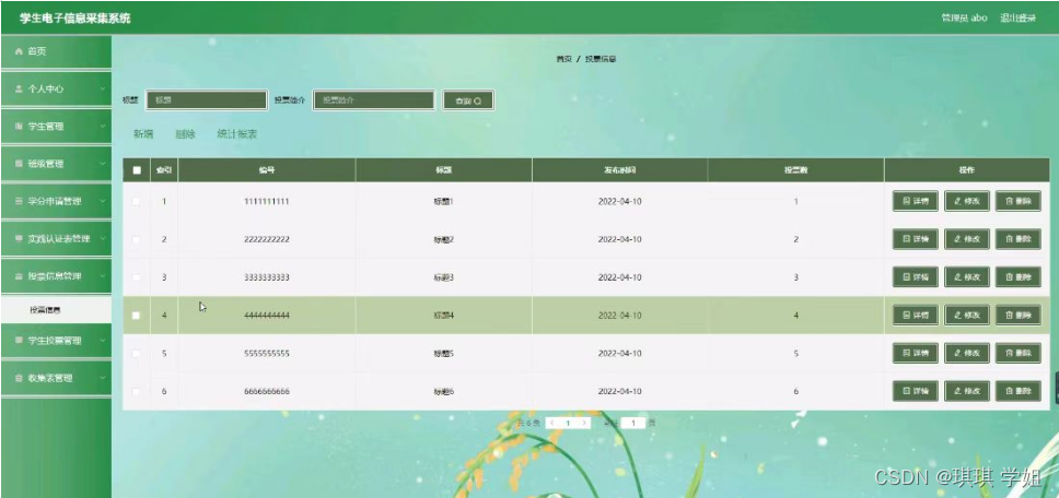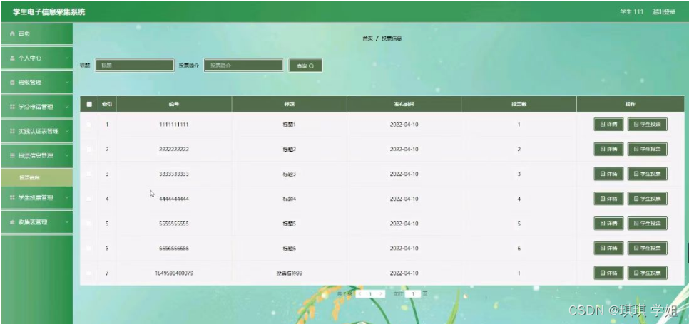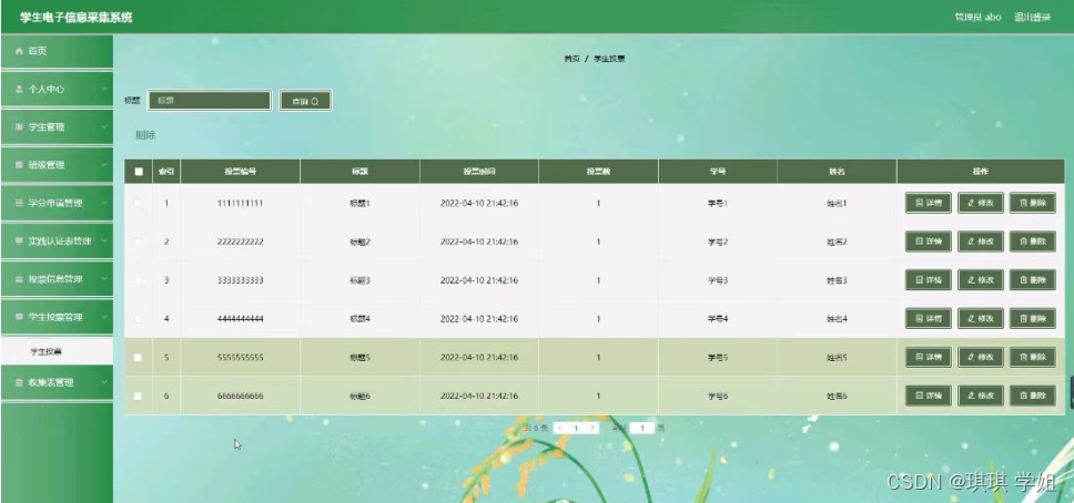 学生投票管理,在学生投票管理页面可以对索引,投票编号,标题,投票时间,投票数,学号,姓名等内容进行详情修改和删除等操作,如图5-8所示。