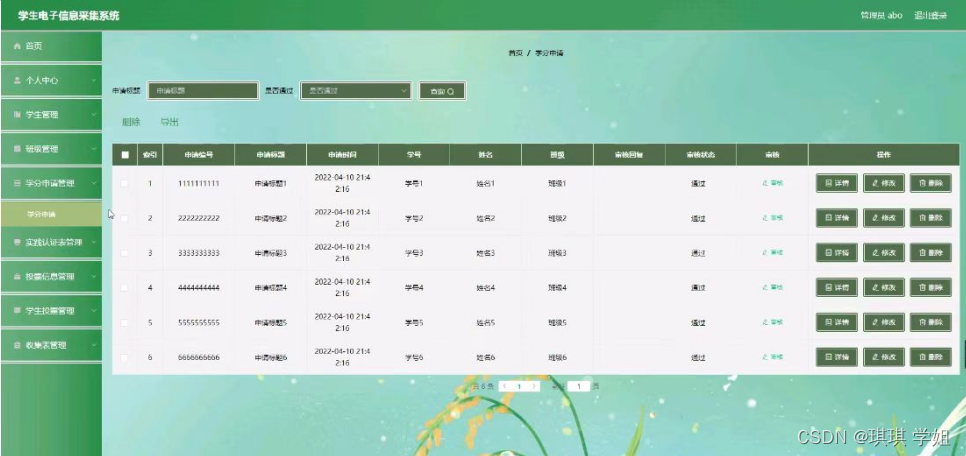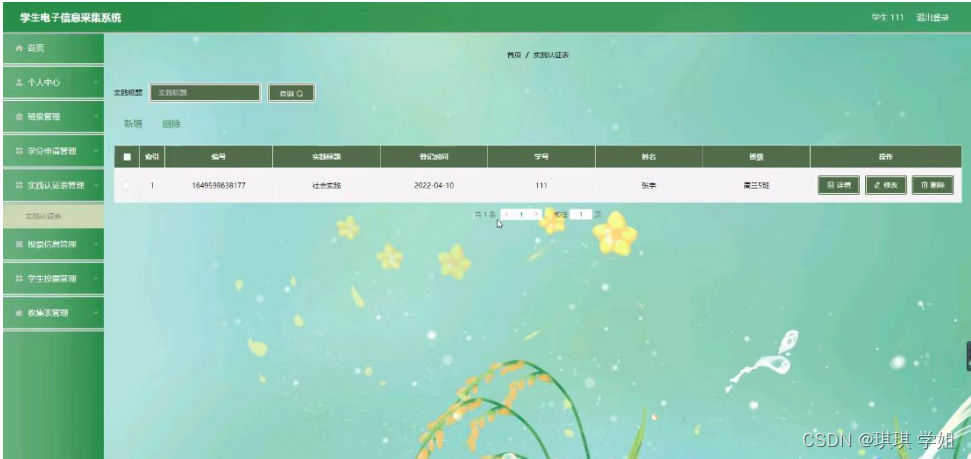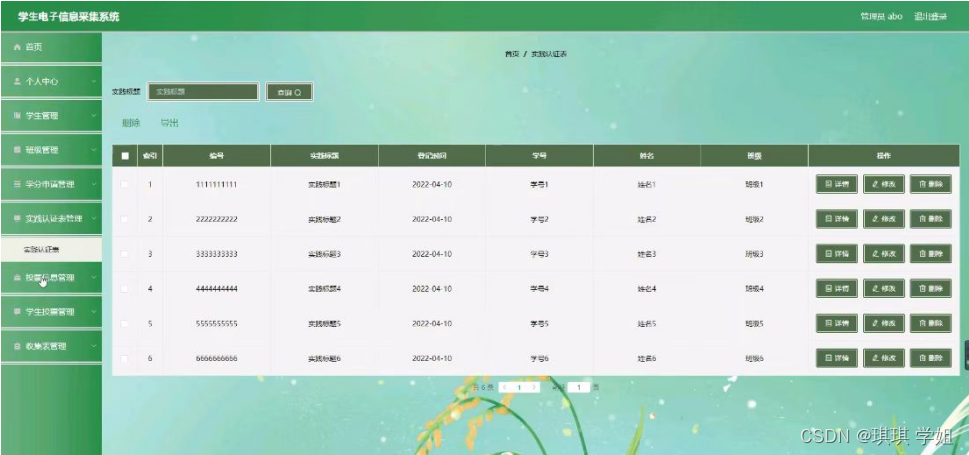实践认证表管理,在实践认证表管理页面可以对索引,编号,实践标题,登记时间,学号,姓名,班级等内容进行申请,修改,删除等操作,如图5-6所示。