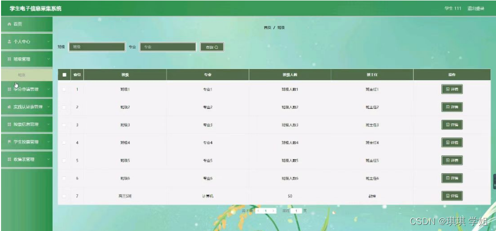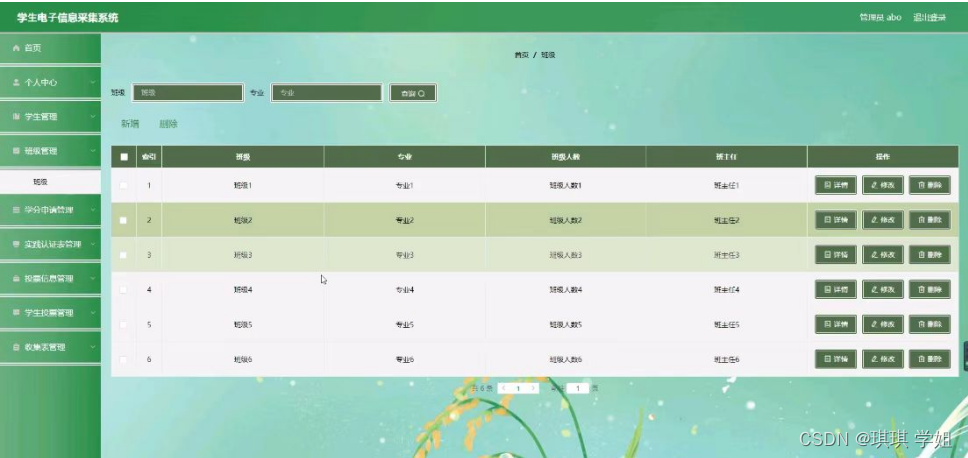 班级管理,在班级管理页面可以对索引,班级,专业,班级人数,班主任等内容进行详情,修改和删除等操作,如图5-4所示。