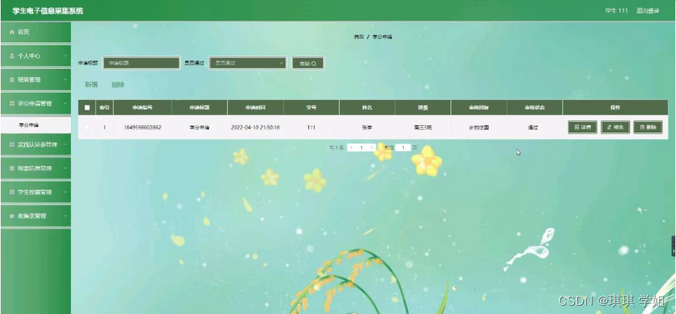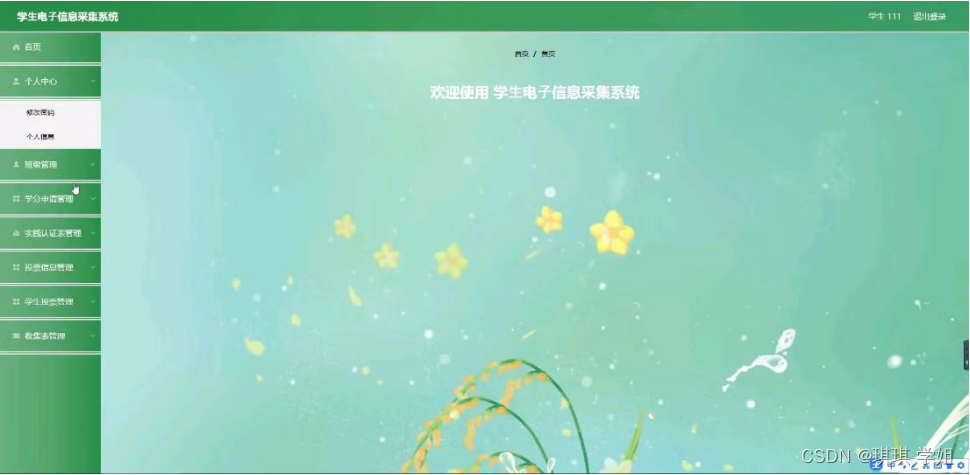 学生登录进入系统可以对首页,个人中心,班级管理,学分申请管理,实践认证表管理,投票信息管理,学生投票管理,收集表管理等功能进行详细操作,如图5-10所示。