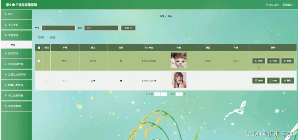 学生管理,在学生管理页面可以对首页,学号,姓名,性别,学生电话,头像,班级,专业等内容进行详情,修改和删除等操作,如图5-3所示。