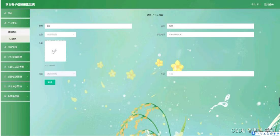 个人中心,在个人信息页面通过填写学号,性别,头像,班级,姓名,学生电话,专业等内容并提交进行个人信息修改操作,如图5-11所示。