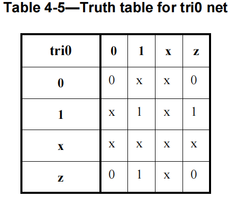 表4-5和表4-6是对具有strong强度的tri0和tri1 net的多个驱动建模的真值表。关于net的结果值具有强度strong,除非两个驱动器都是z,在这种情况下,net具有pull强度。