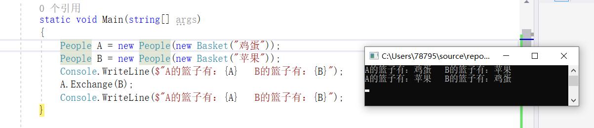 {class Program{static void Main(string[] args){People A = new People(new Basket("鸡蛋"));People B = new People(new Basket("苹果"));Console.WriteLine($"A的篮子有:{A} B的篮子有:{B}");A.Exchange(B);Console.WriteLine($"A的篮子有:{A} B的篮子有:{B}");}}//篮子public class Basket {private object thing;//{get;set;}public Basket(){}public Basket(object obj){this.thing = obj;}public object GetThing() {return this.thing;}public void SetThing(object thing){this.thing = thing;}public override string ToString(){return GetThing().ToString();}}//人public class People {public Basket basket = new Basket();public People(Basket obj) {basket = obj;}public void Exchange(People man){//空篮子Basket tmp = new Basket();//别人的东西先放空篮子tmp.SetThing(man.basket.GetThing());//我的东西给别人man.basket.SetThing(basket.GetThing());//我从空篮子拿东西this.basket.SetThing(tmp.GetThing());}public override string ToString() {return basket.GetThing().ToString();}}