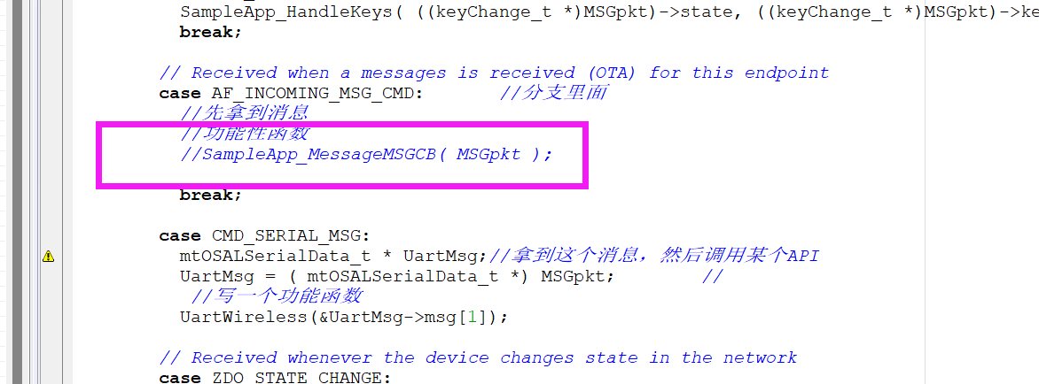 {uint8 i = 0;uint8 rx_buf[MT_UART_DEFAULT_MAX_RX_BUFF], rx_len = 0;(void)event;while (Hal_UART_RxBufLen(port)){ //循环将 DMA 中接收到的串口数据读出来,并放入缓冲区 rx_buf;HalUARTRead(port, &rx_buf[rx_len], 1);rx_len++;}if (rx_len != 0) { //确保缓冲区中有数据;pMsg = (mtOSALSerialData_t *)osal_msg_allocate( sizeof( mtOSALSerialData_t ) + rx_len + 1);//为消息分配内存空间;pMsg->hdr.event = CMD_SERIAL_MSG; //指定了消息的类型,将串口数据复制到消息的数据区,数据的格式为:数据长度+数据pMsg->msg = (uint8*)(pMsg + 1);pMsg->msg[0] = rx_len;for (i = 0; i < rx_len; i++){pMsg->msg[i + 1] = rx_buf[i];}osal_msg_send( App_TaskID, (byte *)pMsg );//将消息发送给指定 task_id 的任务。}