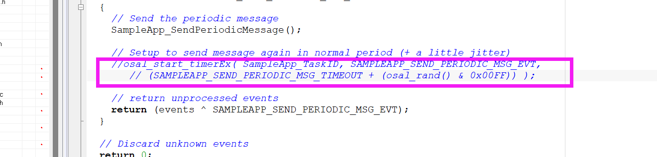 {//调用发送APPAF_DataRequest( &SampleApp_Flash_DstAddr,//填写目的地址+端口号&SampleApp_epDesc,//源(答复和确认)终端的一个描述SAMPLEAPP_FLASH_CLUSTERID,//簇ID strlen(msg), //发送长度msg, //发送缓冲区的第一个buf&SampleApp_TransID, //任务ID号AF_DISCV_ROUTE, //有效位掩码AF_DEFAULT_RADIUS ); //传输跳转数}