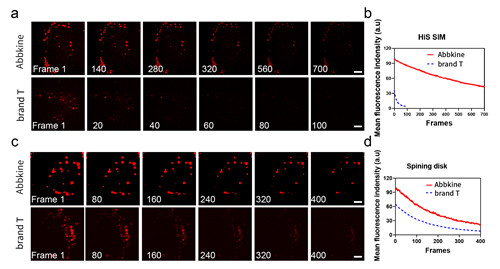 图:Abbkine TraKine™ Pro 活细胞溶酶体染色试剂盒(红色荧光)与 Lyso tracker red 的荧光性能相比:在同等拍摄参数的 HiS-SIM 超 分辨显微镜及 Spining disk 共聚焦显微镜成像,可看出TraKine™ Pro 活细胞溶酶体染色试剂盒(红色荧光)标记效果好、抗漂白能力强。