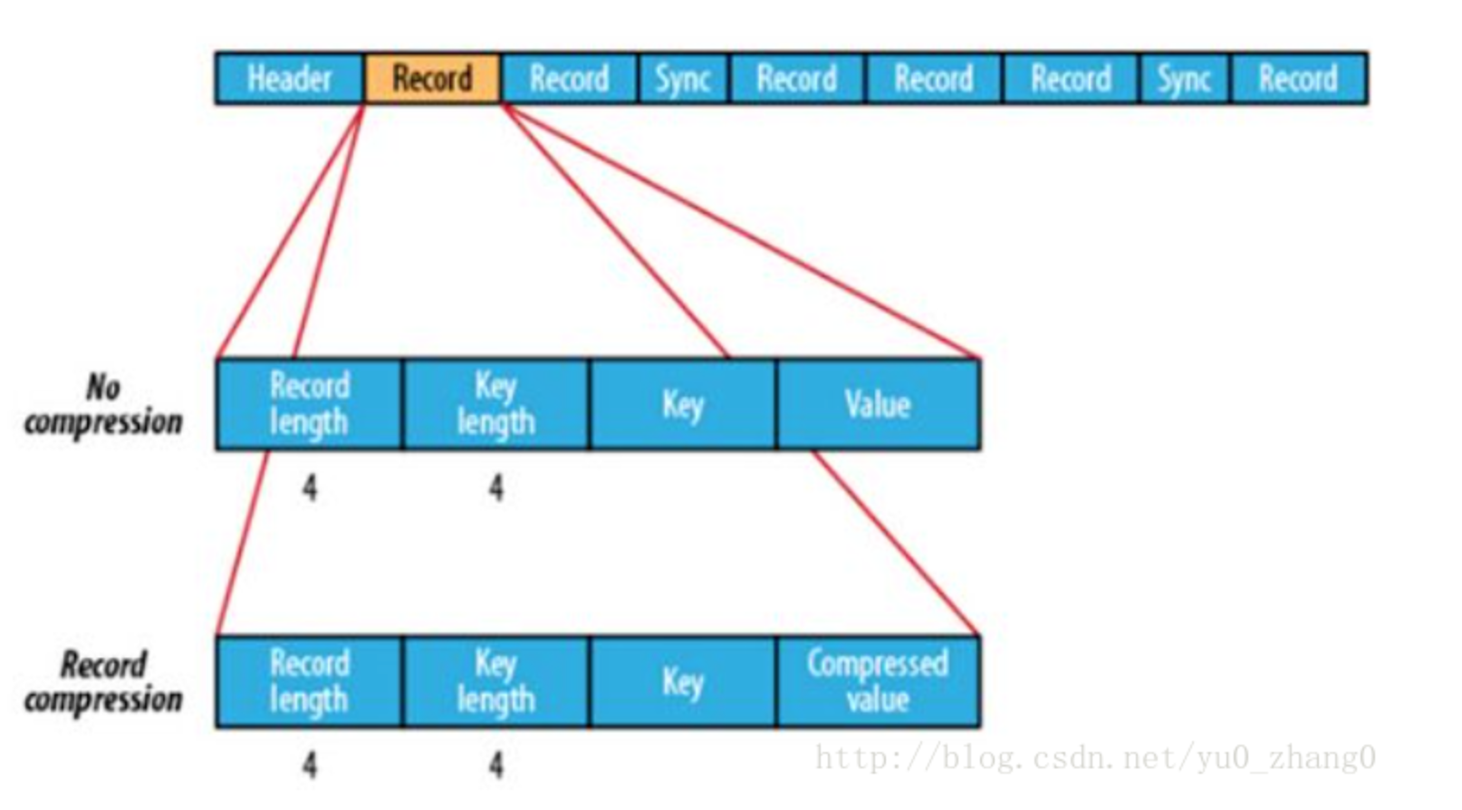 Record:存储SequenceFile通用的KV数据格式,Key和Value都是二进制变长的数据。Record表示Key和Value的byte的总和。