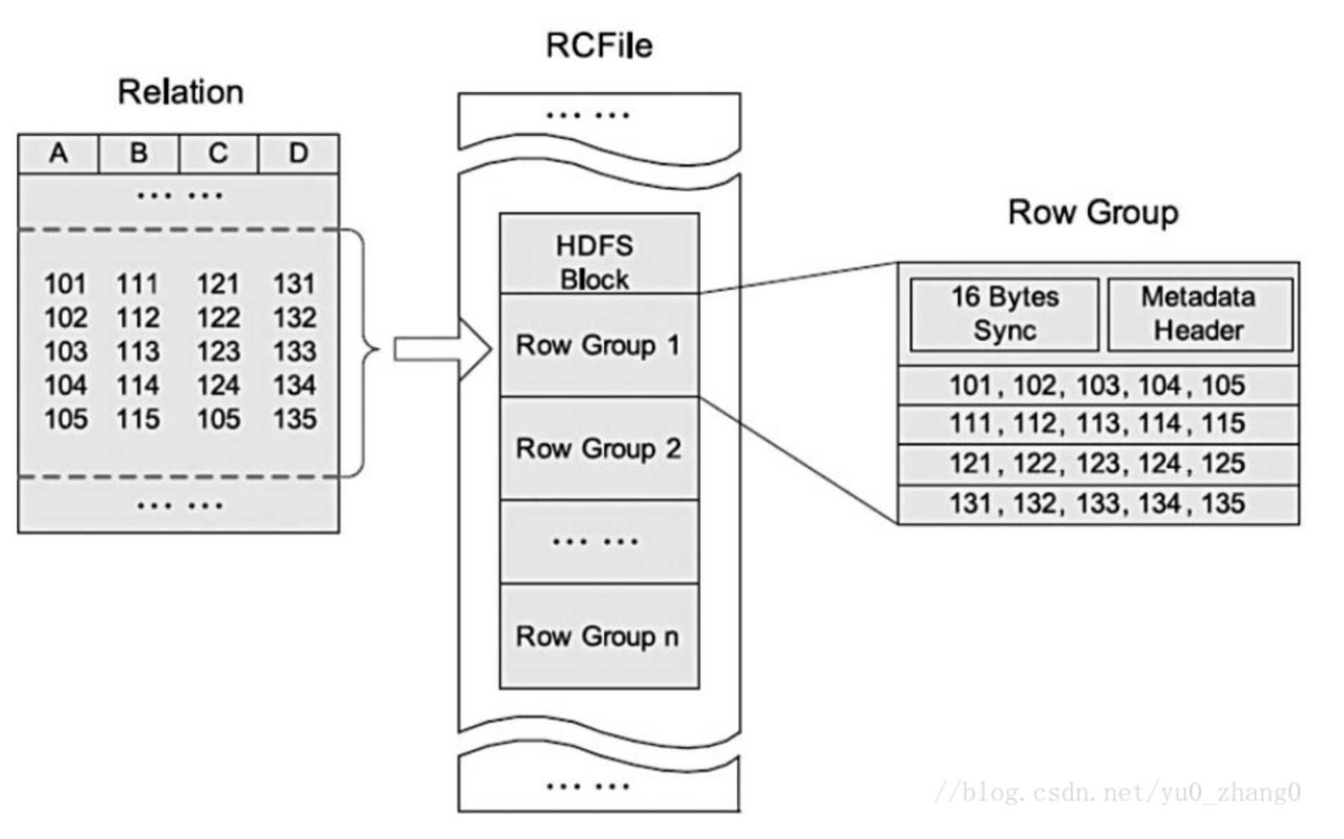 RCFile是一种行列存储相结合的存储方式。首先,其将数据按行分块,保证同一个record在一个块上,避免读一个记录需要读取多个block。其次,块数据列式存储,有利于数据压缩和快速的列存取。