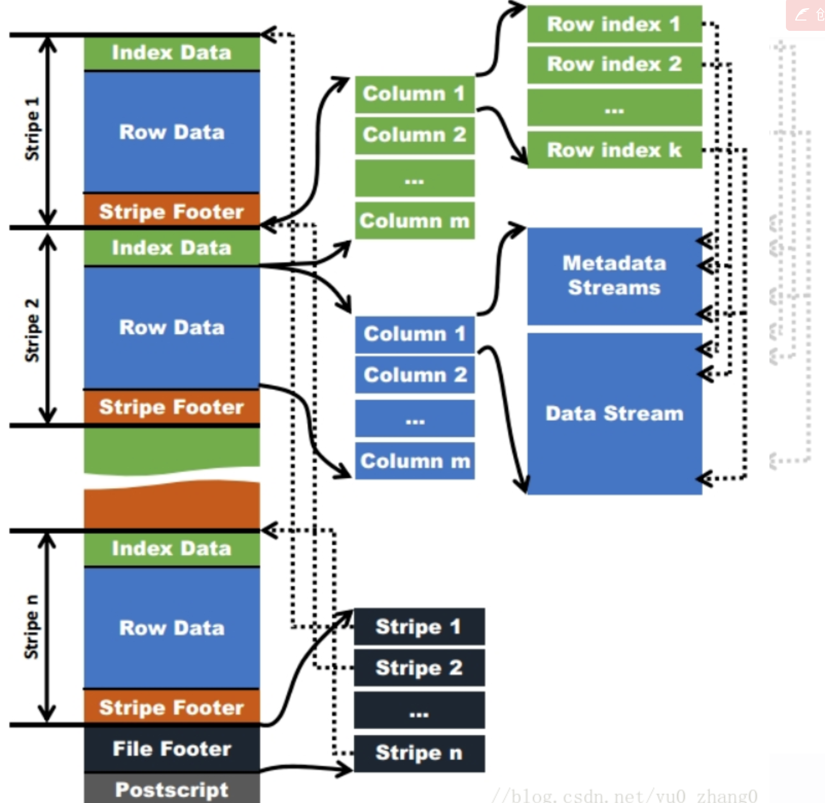 - 处理stripe时首先从Footer中获取每一个stripe的其实位置和长度、每一个stripe的Footer数据(元数据,记录了index和data的的长度),整个striper被分为index和data两部分,stripe内部是按照row group进行分块的(每一个row group中多少条记录在文件的Footer中存储),row group内部按列存储。每一个row group由多个stream保存数据和索引信息。每一个stream的数据会根据该列的类型使用特定的压缩算法保存。