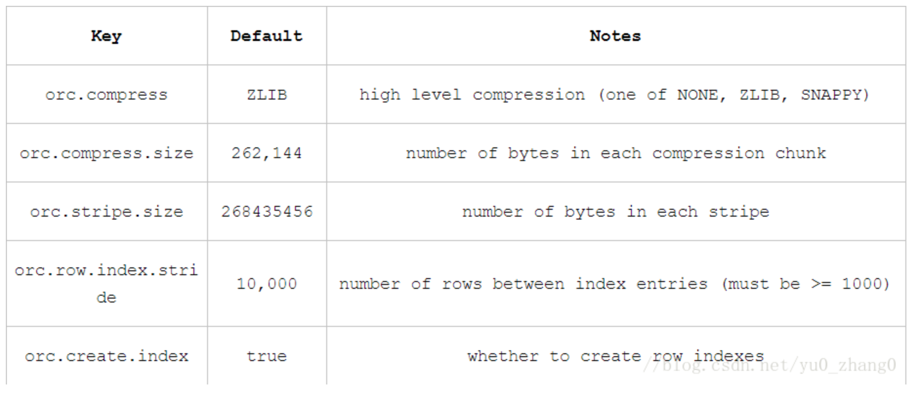 所有关于ORCFile的参数都是在Hive QL语句的TBLPROPERTIES字段里面出现,他们是: