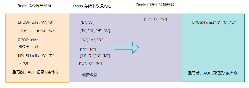 从图中我们可以看出,在重写前 AOF 记录了 6 条命令,在重写后 AOF 只记录了 1 条命令,使得 AOF 文件的体积更小,这样对内存更加友好