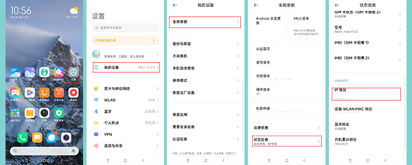 1.依次点击手机设置》我的设备》全部参数》状态信息,在状态信息中,就可以看到安卓手机IP地址了。
