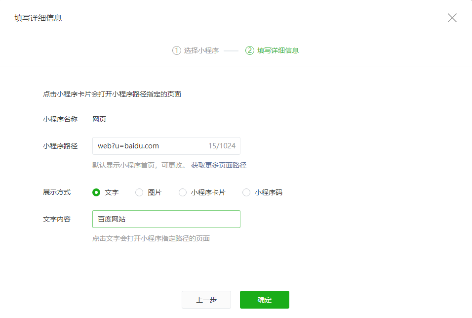 3、小程序的路径改为:“web?u= 网址”的格式,输入文字内容,点击”确定”即可。