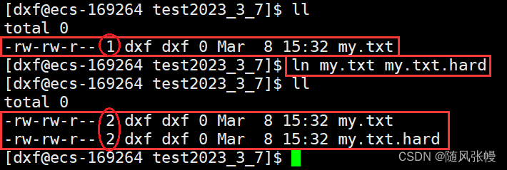 使用命令ln my.txt my.txt.hard建立my.txt的一个硬链接my.txt.hard,如下图所示。