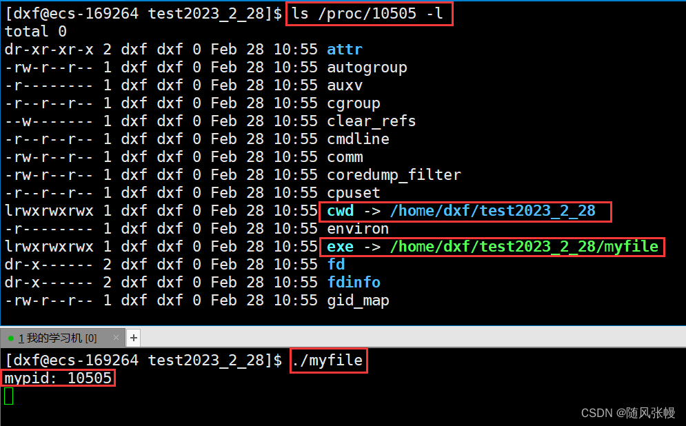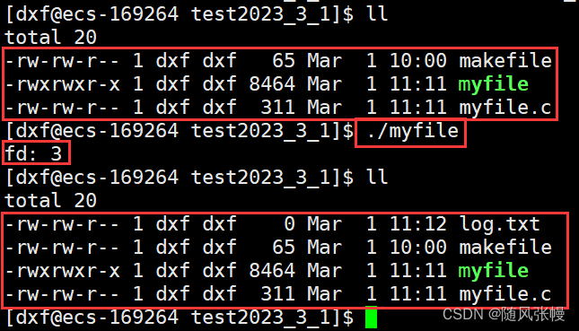 对myfile.c文件里面的代码进行修改,使用chdir函数修改当前进程的工作路径,如下图一所示,然后使用make命令生成可执行程序,使用./myfile执行该程序。打开一个终端,使用命令ls /proc/10505 -l查看进程信息,如下图二所示。如下图三所示,myfile.c文件所处的路径下没有log.txt文件,在/home/dxf路径下可以看到log.txt文件。