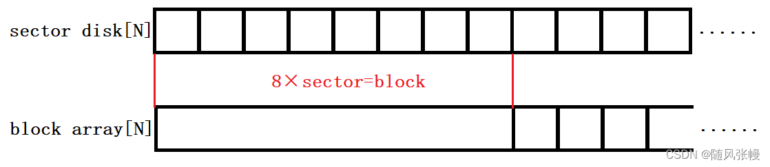 我们把盘片想象成为一个线性的结构,如下图所示,可以将这个线性结构看成一个sector disk[N]数组,数组每一个元素代表一个扇区sector,其大小为512字节。这样如果要定位一个扇区sector,只要找到对应的下标即可,通过这种方式对磁盘的管理就转化成为了对数组空间的管理。