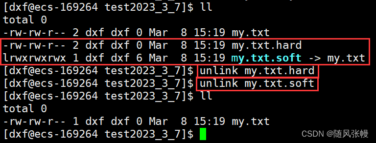 使用命令unlink my.txt.hard删除硬链接文件my.txt.hard。