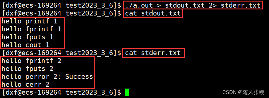 使用命令./a.out > stdout.txt 2> stderr.txt,屏幕上没有打印内容,使用命令cat stdout.txt,可以看到标准输出的部分都在stdout.txt中,使用命令cat stderr.txt,可以看到标准错误的部分都在stderr.txt中,如下图所示。