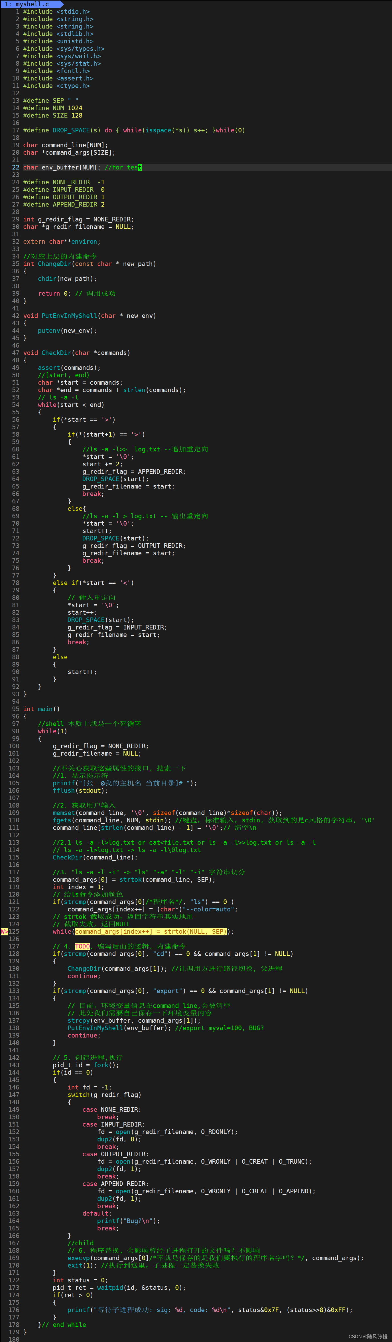 #include#include #include #include #include #include #include #include #include #include #include #define SEP " " #define NUM 1024 #define SIZE 128#define DROP_SPACE(s) do { while(isspace(*s)) s++; }while(0)char command_line[NUM]; char *command_args[SIZE];char env_buffer[NUM]; //for test#define NONE_REDIR -1 #define INPUT_REDIR 0 #define OUTPUT_REDIR 1 #define APPEND_REDIR 2int g_redir_flag = NONE_REDIR; char *g_redir_filename = NULL;extern char**environ;//对应上层的内建命令 int ChangeDir(const char * new_path) {chdir(new_path);return 0; // 调用成功 }void PutEnvInMyShell(char * new_env) {putenv(new_env); }void CheckDir(char *commands) {assert(commands);//[start, end)char *start = commands;char *end = commands + strlen(commands);// ls -a -lwhile(start < end){if(*start == '>'){if(*(start+1) == '>'){//ls -a -l>> log.txt --追加重定向*start = '\0';start += 2;g_redir_flag = APPEND_REDIR;DROP_SPACE(start);g_redir_filename = start;break;}else{//ls -a -l > log.txt -- 输出重定向*start = '\0';start++;DROP_SPACE(start);g_redir_flag = OUTPUT_REDIR;g_redir_filename = start;break;}}else if(*start == '<'){// 输入重定向*start = '\0';start++;DROP_SPACE(start);g_redir_flag = INPUT_REDIR;g_redir_filename = start;break;}else {start++;}} }int main() {//shell 本质上就是一个死循环while(1){g_redir_flag = NONE_REDIR;g_redir_filename = NULL;//不关心获取这些属性的接口, 搜索一下//1. 显示提示符printf("[张三@我的主机名 当前目录]# ");fflush(stdout);//2. 获取用户输入memset(command_line, '\0', sizeof(command_line)*sizeof(char));fgets(command_line, NUM, stdin); //键盘,标准输入,stdin, 获取到的是c风格的字符串, '\0'command_line[strlen(command_line) - 1] = '\0';// 清空\n//2.1 ls -a -l>log.txt or cat >log.txt or ls -a -l// ls -a -l>log.txt -> ls -a -l\0log.txtCheckDir(command_line);//3. "ls -a -l -i" -> "ls" "-a" "-l" "-i" 字符串切分command_args[0] = strtok(command_line, SEP);int index = 1;// 给ls命令添加颜色if(strcmp(command_args[0]/*程序名*/, "ls") == 0 ) command_args[index++] = (char*)"--color=auto";// strtok 截取成功,返回字符串其实地址// 截取失败,返回NULLwhile(command_args[index++] = strtok(NULL, SEP));// 4. TODO, 编写后面的逻辑, 内建命令if(strcmp(command_args[0], "cd") == 0 && command_args[1] != NULL){ChangeDir(command_args[1]); //让调用方进行路径切换, 父进程continue;}if(strcmp(command_args[0], "export") == 0 && command_args[1] != NULL){// 目前,环境变量信息在command_line,会被清空// 此处我们需要自己保存一下环境变量内容strcpy(env_buffer, command_args[1]);PutEnvInMyShell(env_buffer); //export myval=100, BUG?continue;}// 5. 创建进程,执行pid_t id = fork();if(id == 0){int fd = -1;switch(g_redir_flag){case NONE_REDIR:break;case INPUT_REDIR:fd = open(g_redir_filename, O_RDONLY);dup2(fd, 0);break;case OUTPUT_REDIR:fd = open(g_redir_filename, O_WRONLY | O_CREAT | O_TRUNC);dup2(fd, 1);break;case APPEND_REDIR:fd = open(g_redir_filename, O_WRONLY | O_CREAT | O_APPEND);dup2(fd, 1);break;default:printf("Bug?\n");break;}//child// 6. 程序替换, 会影响曾经子进程打开的文件吗?不影响//exec*?execvp(command_args[0]/*不就是保存的是我们要执行的程序名字吗?*/, command_args);exit(1); //执行到这里,子进程一定替换失败}int status = 0;pid_t ret = waitpid(id, &status, 0);if(ret > 0){printf("等待子进程成功: sig: %d, code: %d\n", status&0x7F, (status>>8)&0xFF);}}// end while } makefile代码: