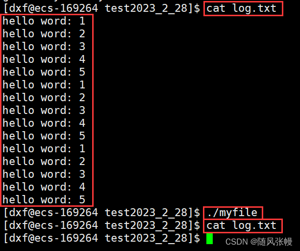 对myfile.c文件里面的代码进行修改,fopen函数使用w选项打开文件并且不再写入内容,如下图一所示,然后使用make命令生成可执行程序,先cat log.txt发现文件里面有内容,使用./myfile执行该程序后再cat log.txt发现文件里面内容被清空,如下图二所示。