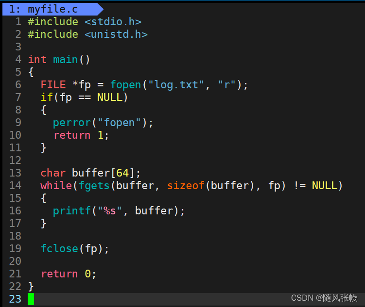 对myfile.c文件里面的代码进行修改,fopen函数使用r选项打开文件并且使用fgets函数读取数据,如下图二所示,然后使用make命令生成可执行程序,打开log.txt写入一些内容,如下图三所示,使用./myfile执行该程序,如下图四所示。