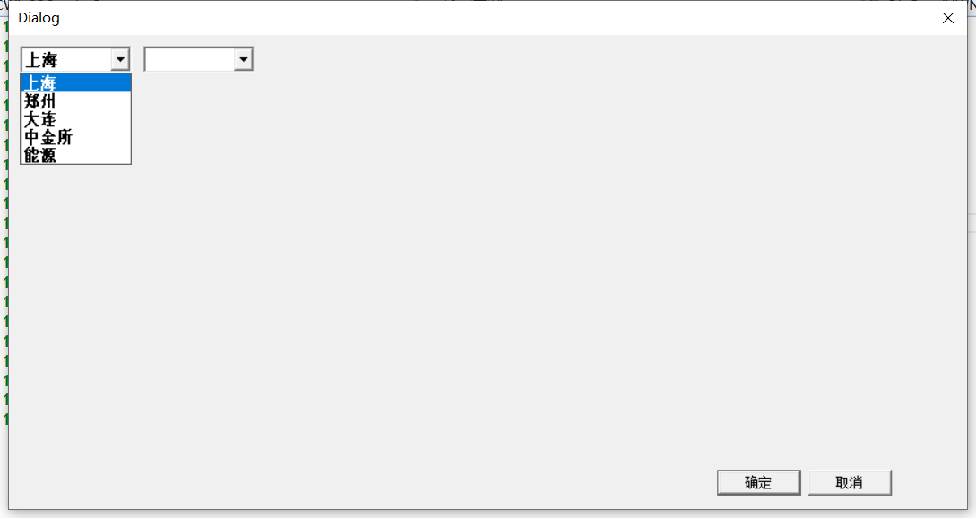 {switch (msg){case WM_INITDIALOG:{//第一个ComBox控件,左上角的坐标点:P(10,10),宽为100,高为300,WM_COMMAND消息下控件的识别码1001hCBox_1 = combox.OnCreate(hDlg, hgInst, 10, 10, 100, 300, 1001);std::vector<std::string>SelectionsOfComBox = { "上海","郑州","大连","中金所","能源" };combox.AddSelectionsForComBox(hCBox_1, SelectionsOfComBox);SelectionsOfComBox.clear();//第二个ComBox控件,左上角的坐标点:P(120,10),宽为100,高为300,WM_COMMAND消息下控件的识别码1002hCBox_2 = combox.OnCreate(hDlg, hgInst, 120, 10, 100, 300, 1002);//第三个ComBox控件,左上角的坐标点:P(230,10),宽为100,高为300,WM_COMMAND消息下控件的识别码1003//第三个ComBox控件,是没有成功建立的,因为CComBox类的实例化对象 combox(2)参数为2,只能建立2个ComBox控件hCBox_3 = combox.OnCreate(hDlg, hgInst, 230, 10, 50, 300, 1003);//会弹出MessageBox()提示框,显示没有成功创建return (INT_PTR)TRUE;}break;case WM_SYSCOMMAND:{if (wParam == SC_CLOSE){DestroyWindow(hdlg);//销毁窗口PostQuitMessage(0);//退出进程}return 0;}break;case WM_COMMAND:{switch (LOWORD(wParam))//WM_COMMAND消息低字节表示来源:来自窗口内部不同控件的点击消息{case IDOK:{DestroyWindow(hdlg);//销毁窗口PostQuitMessage(0);//退出进程return (INT_PTR)TRUE;}break;case IDCANCEL:{DestroyWindow(hdlg);//销毁窗口PostQuitMessage(0);//退出进程return (INT_PTR)TRUE;}break;case 1001://控件1hCBox_1创建时设定的标识符1001{if(HIWORD(wParam) == CBN_SELCHANGE)WM_COMMAND消息高字节表示控件内部不同选项被点击的点击消息{INT NumSelect = SendMessage(hCBox_1, CB_GETCURSEL, 0, 0);//结果正确,分别为0、1、2、3、4选项CB_GETLBTEXTstd::vector<std::string>vect_zhuli;//定义一个vector保存hCBox_2控件的选项switch (NumSelect){case 0://选项0,切换上海市场,合约组合框加载上海合约{SendMessageW(hCBox_1, CB_SETCURSEL, 0, 0);///交易所组合框默认0项被选中(上海),仅仅是界面上看看,并不代表实际的数据传递vect_zhuli = { "上海1","上海2", "上海3", "上海4", "上海5", "上海6", "上海7", "上海8", "上海9", "上海10", "上海11", "上海12", "上海13", "上海14", "上海15" };}break;case 1://选项1,切换郑州市场,合约组合框加载郑州合约{SendMessageW(hCBox_1, CB_SETCURSEL, 1, 0);///交易所组合框默认1项被选中(郑州),仅仅是界面上看看,并不代表实际的数据传递vect_zhuli = { "郑州1","郑州2", "郑州3", "郑州4", "郑州5", "郑州6", "郑州7", "郑州8", "郑州9", "郑州10", "郑州11", "郑州12", "郑州13", "郑州14", "郑州15" };}break;case 2://选项2,切换大连市场,合约组合框加载大连合约{SendMessageW(hCBox_1, CB_SETCURSEL, 2, 0);///交易所组合框默认2项被选中(大连),仅仅是界面上看看,并不代表实际的数据传递vect_zhuli = { "大连1","大连2", "大连3", "大连4", "大连5", "大连6", "大连7", "大连8", "大连9", "大连10", "大连11", "大连12", "大连13", "大连14", "大连15" };}break;case 3://选项3,切换中金所市场,合约组合框加载中金所合约{SendMessageW(hCBox_1, CB_SETCURSEL, 3, 0);///交易所组合框默认3项被选中(中金所),仅仅是界面上看看,并不代表实际的数据传递vect_zhuli = { "中金所1","中金所2", "中金所3", "中金所4", "中金所5", "中金所6", "中金所7", "中金所8", "中金所9", "中金所10", "中金所11", "中金所12", "中金所13", "中金所14", "中金所15" };}break;case 4://选项4,切换能源市场,合约组合框加载能源中心合约{SendMessageW(hCBox_1, CB_SETCURSEL, 4, 0);///交易所组合框默认4项被选中(能源),仅仅是界面上看看,并不代表实际的数据传递vect_zhuli = { "能源1","能源2", "能源3", "能源4", "能源5", "能源6", "能源7", "能源8", "能源9", "能源10", "能源11", "能源12", "能源13", "能源14", "能源15" };}break;default:break;}combox.ChangeSelections(hCBox_2, vect_zhuli);//根据控件hCBox_1点击的不同选项,给hCBox_2加载相应的vect_zhuli选项vect_zhuli.clear();}}break;case 1002://控件1hCBox_2创建时设定的标识符1002{if (HIWORD(wParam) == CBN_SELCHANGE)WM_COMMAND消息高字节表示控件内部不同选项被点击的点击消息{char* szInfo = new char[124];szInfo = combox.GetSelectionStr(hDlg, 1002);MessageBoxA(NULL, szInfo, "第二个组合框的选项", MB_OK);delete[]szInfo;}}break;case 1003://控件1hCBox_3创建时设定的标识符1003{//这个控件从来就没有创建成功//因为:第8行代码://CComBox combox(2);// CComBox类的实例化对象,一个类对象combox可以建立2个CComBox控件}break;default:break;}}break;}return (INT_PTR)FALSE;