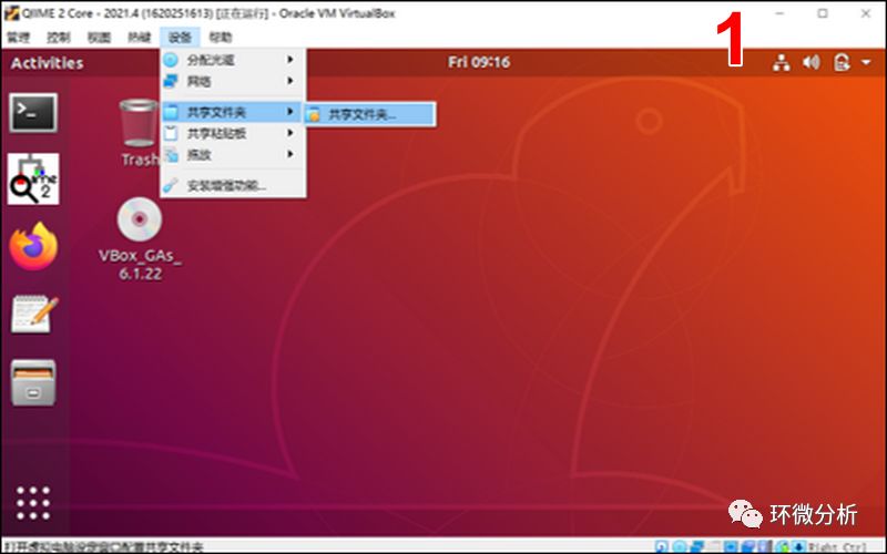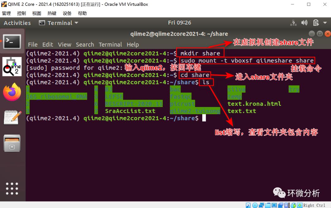 在虚拟机中挂载共享文件夹,点击左侧Terminal打开终端窗口。输入命令:mkdir share ;然后再输入命令:sudo mount –t vboxsf qiimeshare share即可实现挂载。其中,命令mkdir share是在QIIME虚拟系统环境中创建一个名为“share”的文件夹,命令sudo mount –t vboxsf qiimeshare share是将Windows系统里创建的文件夹“qiimeshare”与QIIME虚拟系统环境中的“share”文件夹链接起来,这两个文件夹中的所有文件能够实现即时共享。