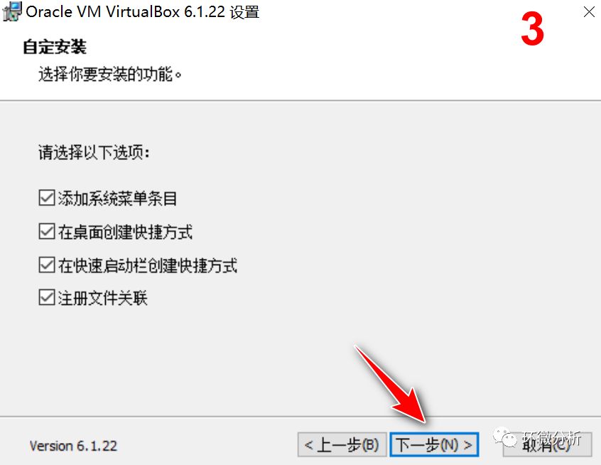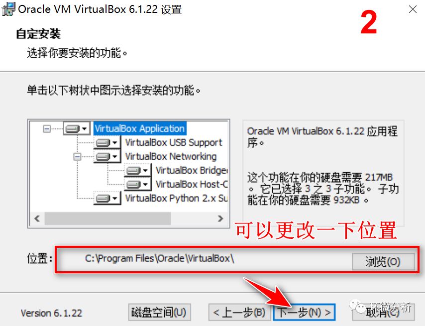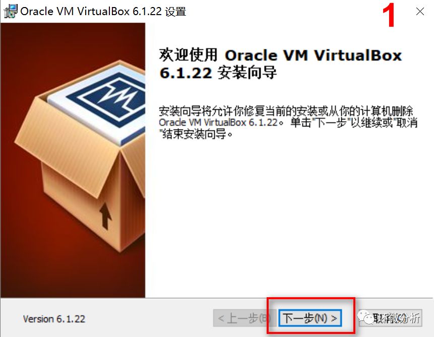 安装虚拟机——先双击运行VirtualBox-6.1.22-144080-Win.exe,进入安装向导界面。点击“下一步”。