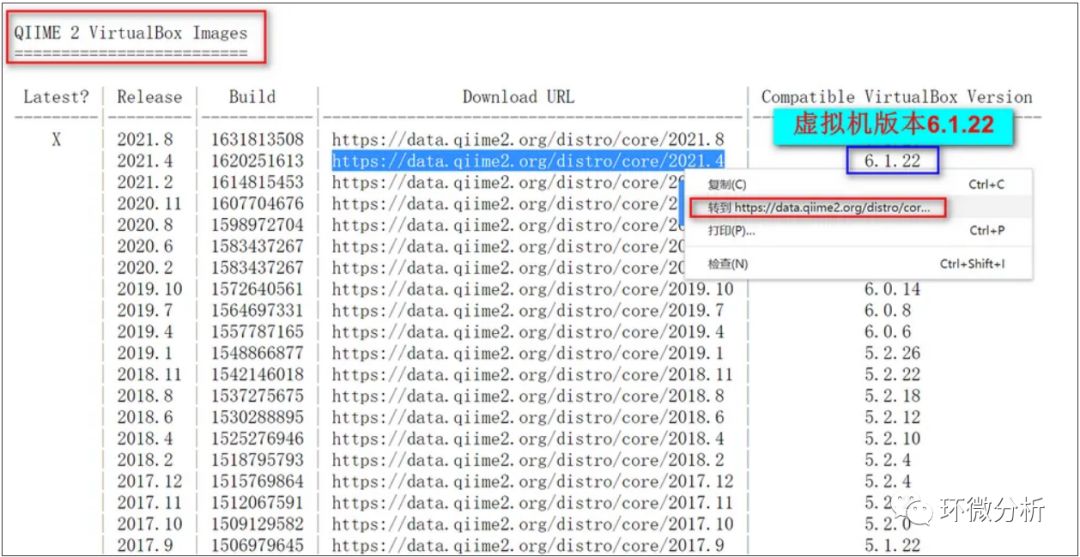 如果下载的虚拟机版本与QIIME 2镜像安装包不匹配,可以进入网页“Download_Old_Builds – Oracle VM VirtualBox”寻找历史的匹配版本。下载VirtualBox 6.1.22。