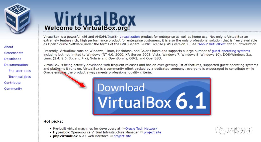点击“http://virtualbox.org/”跳转到虚拟机下载界面。在此界面下,点击蓝色按钮往往下载的是最新虚拟机。