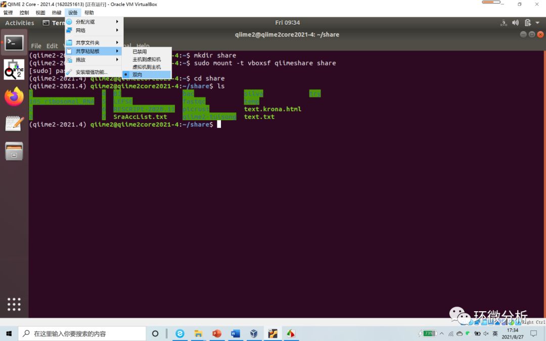 设置虚拟机的双向剪贴板同步,这样可以在QIIME虚拟机系统与Windows系统之间执行复制黏贴快捷命令。