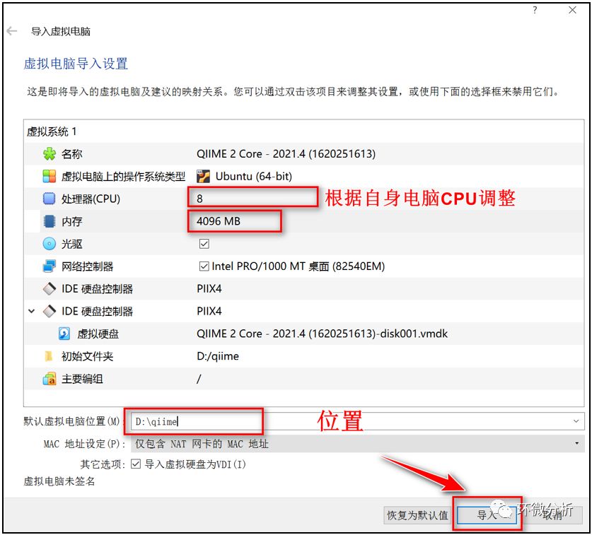 在导入窗口中,选择QIIME虚拟系统可支配的内存和CPU核心数,一般视电脑的配置情况而定(进入设备管理器—查看电脑的处理器数量),在处理一般数据时最少需要4个CPU核心和8GB内存。所给运行内存和CPU越多,虚拟机中的QIIME2处理数据的速度越快。选择合适的安装位置,点击“导入”开始安装。