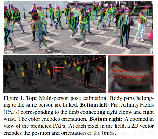 Figure 1.顶部:多人姿势估计。 同一个人的身体部位之间用线相连。 左下:部分亲和力字段(PAFs)对应于连接右肘和右侧的肢体腕。 颜色编码方向。 右下:放大预测的PAF的视图。 在场中的每个像素处,2D矢量编码四肢的位置和方向。