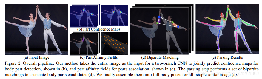 Figure 2.整体过程。 我们将整个图像作为双分支CNN的输入来联合预测置信图,(b)中所示的身体部位检测,以及(c)中所示的部位关联的部分亲和力字段。 解析步骤执行一组二分匹配身体部位候选人的匹配(d)。 我们最终将它们组装成图像中所有人的全身姿势(e)。