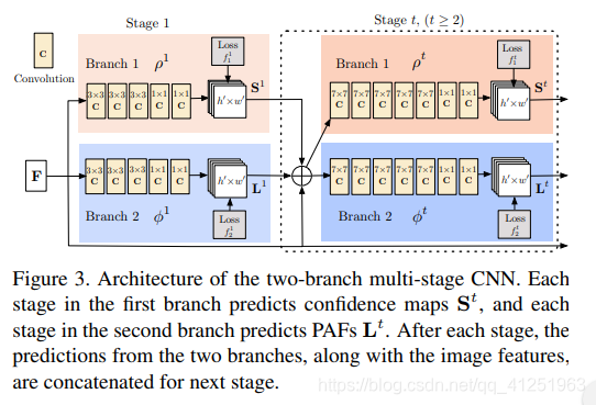 Figure 3.双分支多级CNN的体系结构。 每第一个分支中的阶段预测置信度图 ${S}^{t}$,每一个
