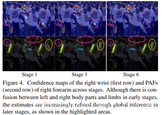 Figure 4.各个阶段的右手腕(第一排)和PAF的置信度图(第二排)右前臂。 虽然在早期阶段左右身体部位和四肢之间经常会混乱,但是通过后期阶段的全面推理,预测越来越精确,如图中高亮区域所示。
