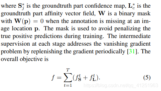 为了引导神经网络以迭代方式在分支一预测身体部位的置信度图和在第二个分支预测PAF,我们在每个阶段结束时应用了两个损失函数,每个分支一个。我们在估计的预测值和真实的关节图,关节连接之间使用L2损失。 在这里,我们在空间上对损失函数进行加权,以解决一些实际问题,即某些数据集并未完全标记所有人。