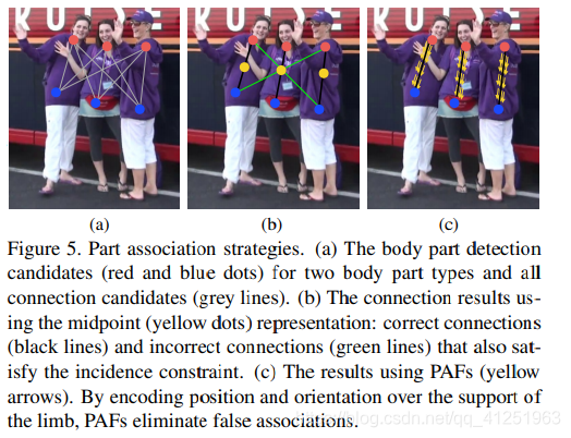 给出一组检测到的身体部位(就像Figure 5a中的红色和蓝色点),我们如何把它们组装成若干个人的完整身体姿态呢?我们需要对每个身体部分的连接进行一个可能性测量,也就是保证它们属于同一个人。一种可能的检测连接的方法是检测每对身体部位之间的肢体的中间点,并检查它在候选身体部位之间发生的可能性,如Figure 5b所示。然而当人们挤在一起的时候,很容易发生这种情况,这些中点可能代表错误的连接(就像Figure 5b中的绿色线)。这些错误连接的产生的原因是由这种表示方法的两种限制:(1)它只编码了位置没有编码方向(2)它缺少了对单个点代表一个肢体的支持。