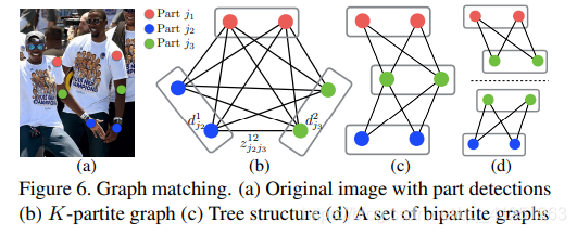 当遇到要找多人的全身身体姿势时,决定了Z是一个K分图匹配问题。这是一个np问题,有很多松弛方法存在。在我们的工作中,我们对最佳匹配添加了两个松弛,针对我们的问题。首先,我们选择最少数量的边来获得人体姿势的生成树骨架,如Figure 6c所示。其次,我们将寻找骨架匹配的问题分解卫了一组二分匹配的问题,并且规定相邻树节点中的匹配相互独立,如Figure 6d所示。我们在3.1节中显示了详细的比较结果,证明了是最小的计算成本并且贪心推理很好地近似逼近全局解决方案。原因是相邻树节点之间的关系被PAF显式建立,但在内部,不相邻的树节点之间由CNN隐式建模。出现这个性质的原因是CNN受到大的感知场训练,并且非相邻树节点的PAF也影响PAF的预测。