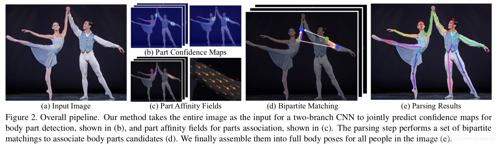 处编码成一个二维向量。最后,confidence map和affinity fields 通过贪婪推理进行解析,如下图(d)所示,从而输出图像中所有人的2D关键点。