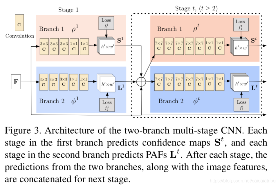 本文的架构如下图所示:该网络包含两个分支,Branch 1 用于预测 confidence map,Branch 2 用于预测 affinity field;两个分支的网络结构完全相同;Branch 1 与Branch 2的Stage 1 共享输入F;Branch 1 与Branch 2的Stage t (t>=2) 的输入为(,