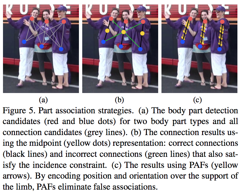 给定一个集合的身体部位检测结果(如下图中的红色和蓝色),如何在不知道图像中人数的情况下去整合这检测出来6个关键点从而构成各个人的身体的肢体?首先我们一个confidence measure用于衡量这一对关键点是否属于同一个个体,如下图所示,最左边的人的红色关键点,与其他三个蓝色关键点均存在连接(灰色连接线,我们可以理解为人的肢体段,比如:红色是胳膊肘,蓝色是手,那么连接线自然就是手臂。),那么这三个候选肢体段到底哪一段才是最左边的这个人的。一种可能的解决方案是通过检测一个额外的在肢体上每对部位的中点,并且检查其在候选部位之间的入射角。如下图(b)所示,由于人之间相互之间拥挤在一块,造成引入中点也没法解决错误的关键点之间的联系,图b中就是错误的连接。这些错误的原因是:只编码位置信息,没有方向信息;将一个区域只用一个点去表示;