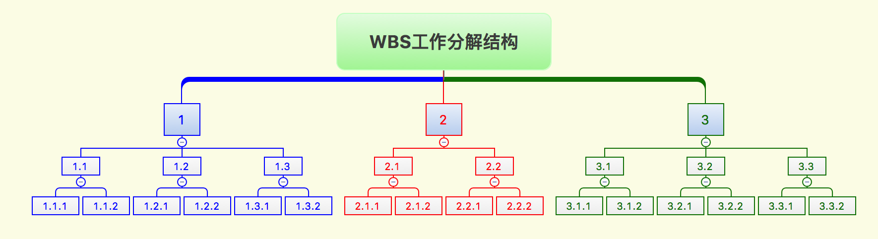 WBS以可交付成果为导向对项目要素进行的分组,它归纳和定义了项目的整个工作范围,每下降一层代表对项目工作的更详细定义。 WBS总是处于计划过程的中心,也是制定进度计划、资源需求、成本预算、风险管理计划和采购计划等的重要基础。WBS同时也是控制项目变更的重要基础。项目范围是由WBS定义的,所以WBS也是一个项目的综合工具。效果如下所示: