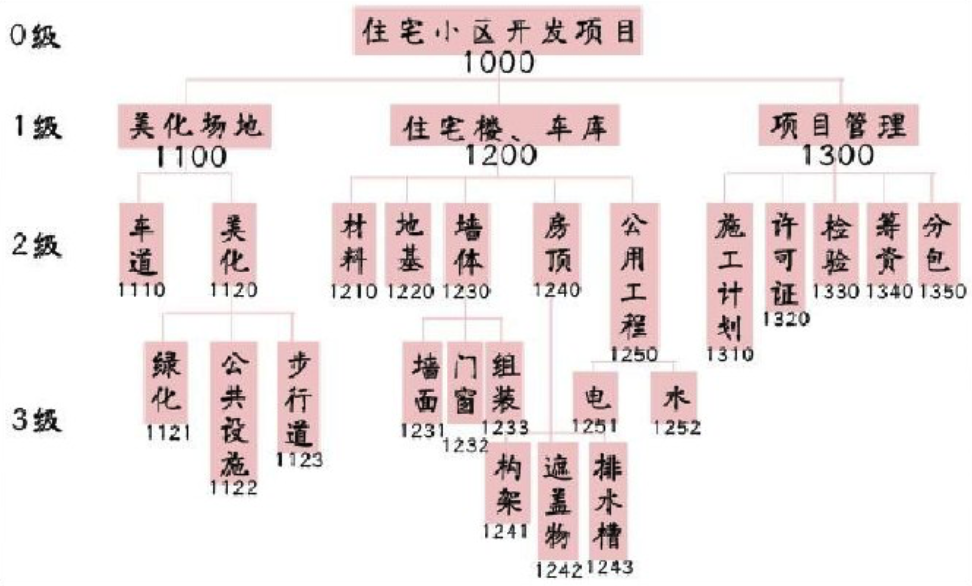 接下来我们看看WBS在工程方面的应用,住宅小区开发项目中的 WBS模型使用 展示,如下所示: