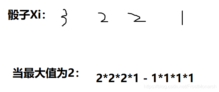 2*2*2*1代表我们每一个骰子大于等于2的我们都认为可以取[1,2]两种可能,至于有1个1,他只有[1,1]种可能。最后为什么需要减呢,因为有可能上面枚举的情况中出现大家出现值都小于2的情况,所以减去[1,1,1,1]这种可能性。