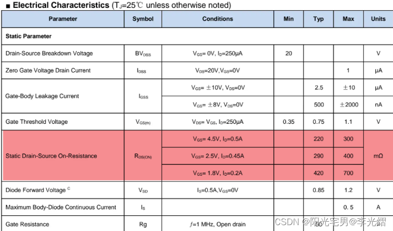 在规格书中的电气特性,也都会标出不同Vgs电压和不同电流下导通电阻值范围。