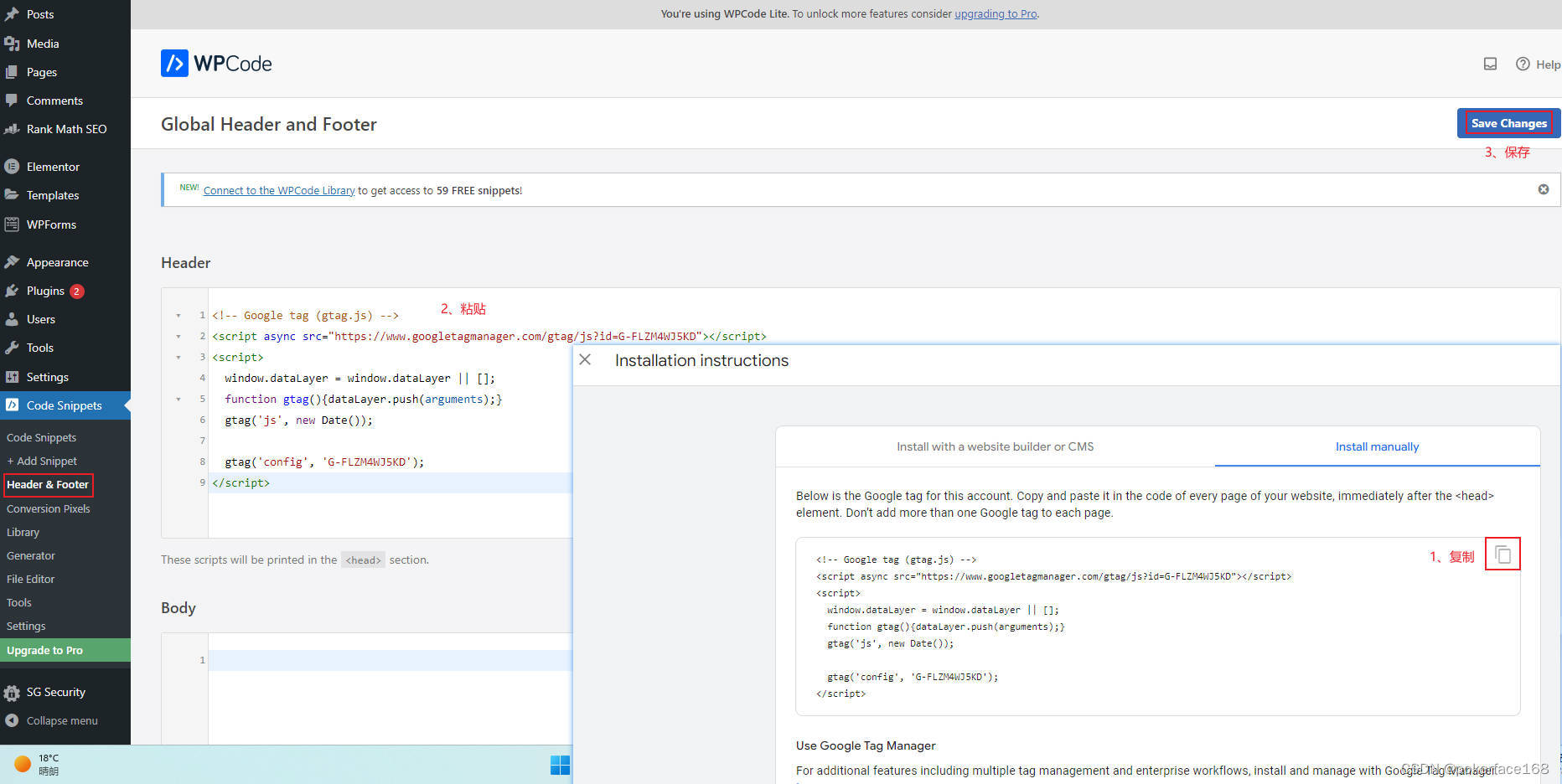 复制该代码并将其粘贴到WordPress后台Code Snippets–Header & Footer的Header输入框中,然后Save Changes保存。