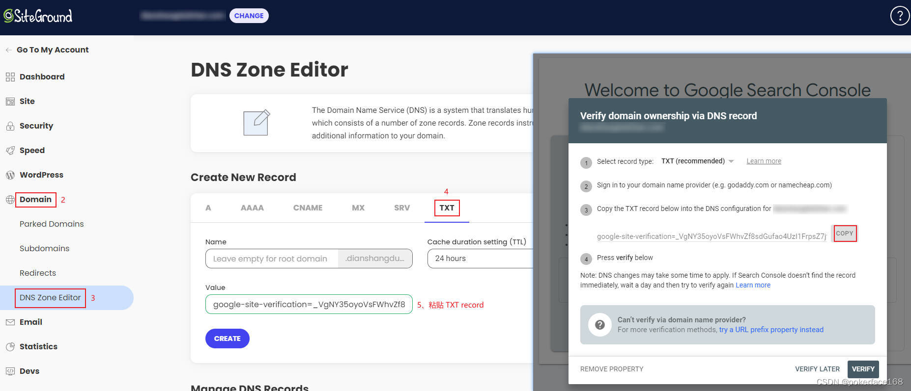 接下来需要粘贴Google Search Console的TXT record到Siteground的DNS Zone。