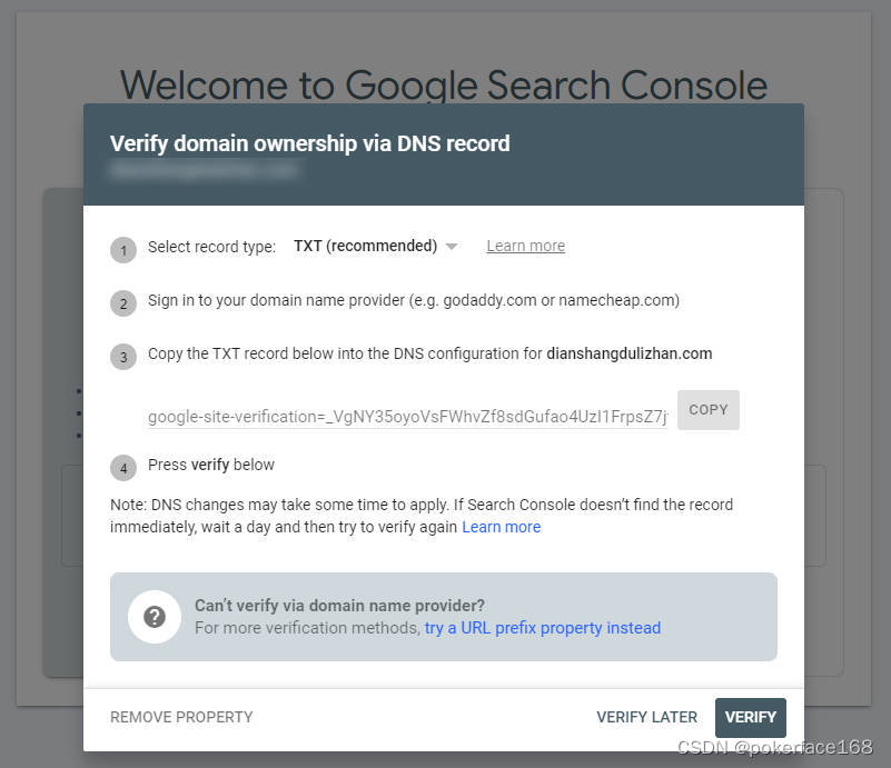 再接下来Google会要求你验证你对该网站的所有权,在Google Search Console上点击Verify。